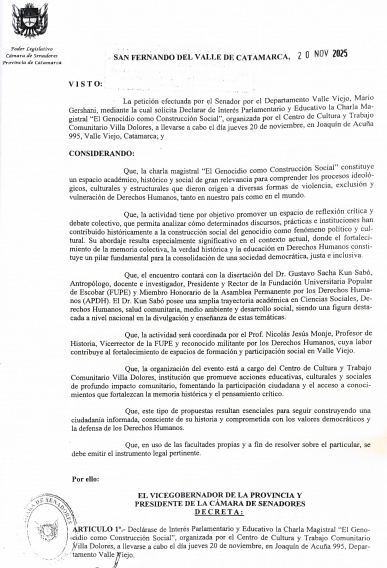 El rector de la FUPE, Lic. Sacha Kun Sabó, brindó el jueves pasado la charla magistral «El Genocidio como Construcción Social» en el Centro de Cultura y Trabajo Comunitario Villa Dolores de Valle Viejo, provincia de Catamarca. Actividad declarada de Interés Parlamentario y Educativo por la Cámara de Senadores provincial.